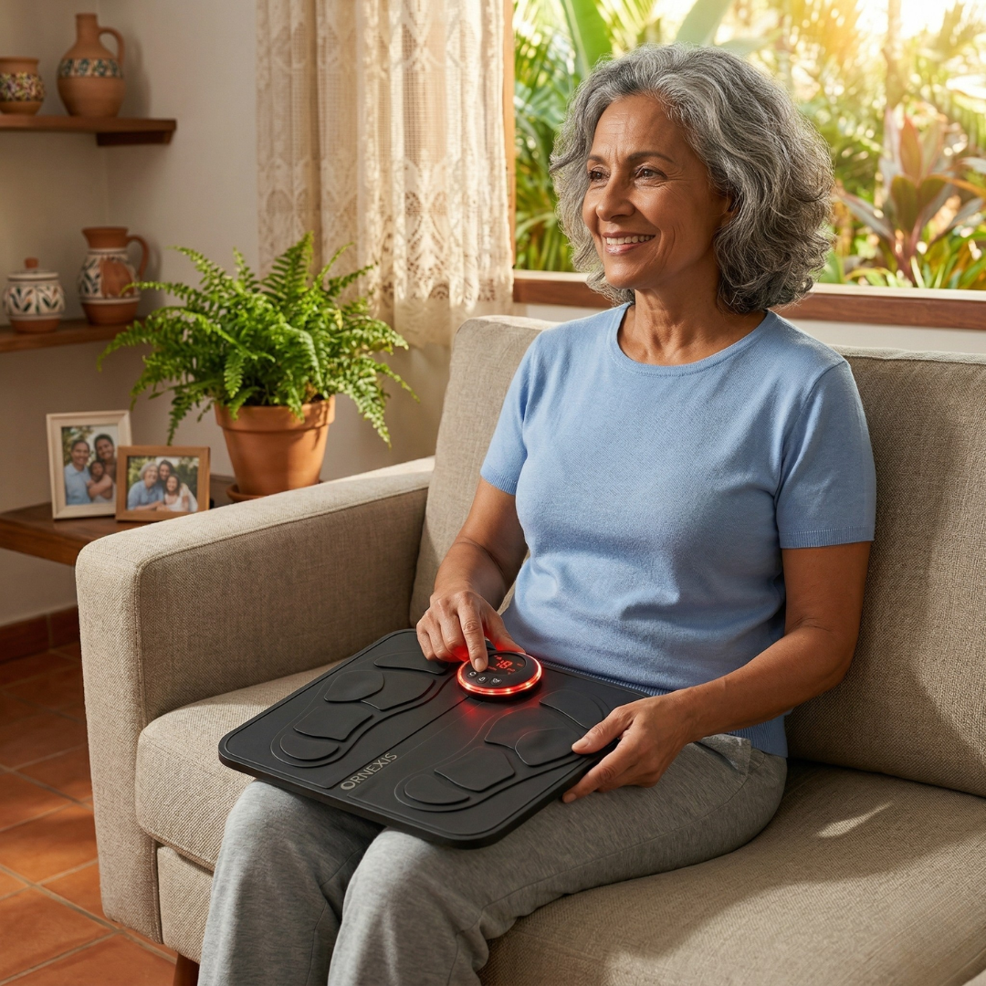 O dispositivo EMS da Ornexis utiliza estimulação elétrica precisa para ativar essa bomba natural e bombear o líquido de volta para cima, contrariando a gravidade, ajudando seus tornozelos a finalmente desincharem.